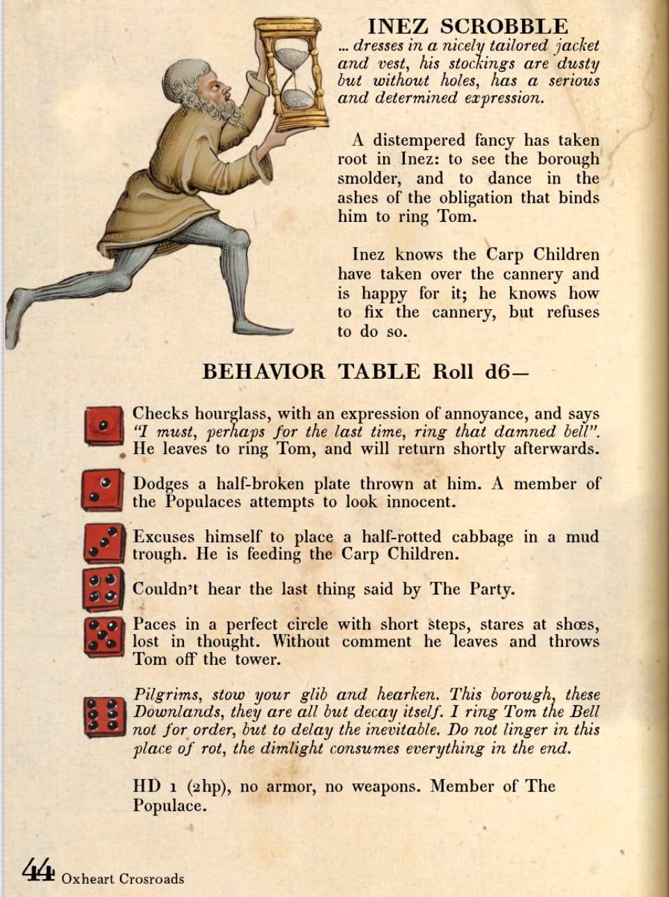 this guy is in the first location you visit, he is supposed to help communicate what the adventure is about (its one of those, you get trapped in a place, and you have to escape adventures). his job is to communicate that this is a bad place to be, and that you should escape. he is supposed to hammer in the motif of decay. he is also supposed to show his alignment with a faction (carp children), to get that faction play going.