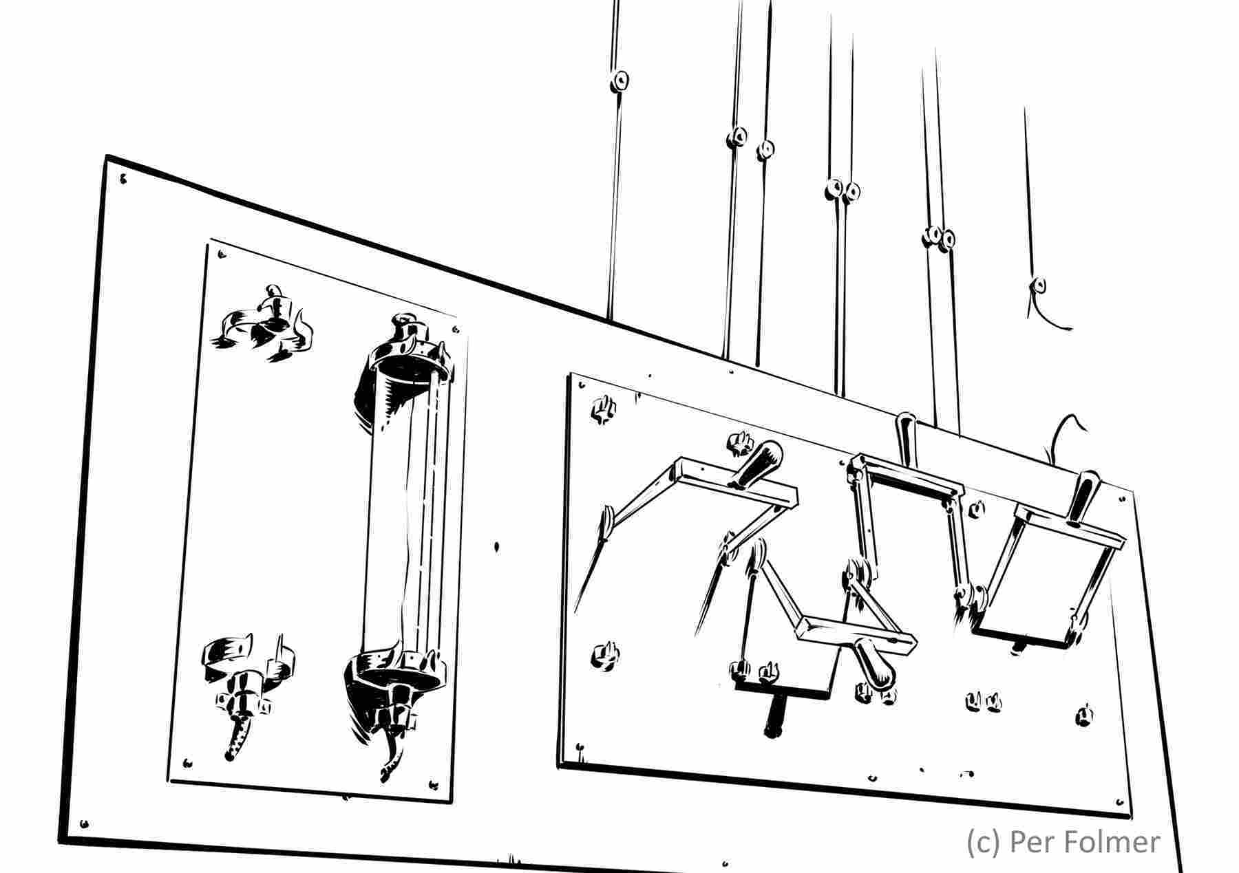 The switches control various lights and motors located within the dungeon. I’ve seen two reactions to it: replace the fuse and flip all the switches back and forth a few times (Do we all have a player who loudly plays all of the keys on the duke’s piano at first opportunity?), or ignore it, because it looks overly complex/dangerous (“my character doesn’t understand what he’s seeing, so I’ll just move on”). There are some non- or semi-functional electro-mechanical devices earlier (and later) in the dungeon, so I do try to telegraph some of the potential outcomes.